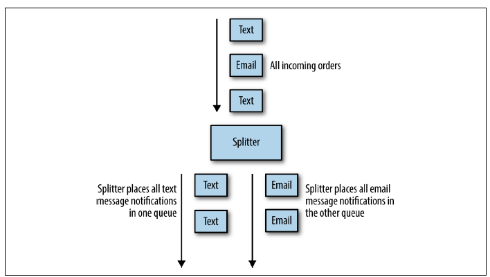 Sometimes you don’t want to just filter things out by dropping them on the floor, but rather you have two different kinds of input present in your set of work items and you want to divide them into two separate work queues without dropping any of them. For this task, you want to use a splitter. The role of a splitter is to evaluate some criteria—just like a filter—but instead of eliminating input, the splitter sends different inputs to different queues based on that criteria. An example of an application of the splitter pattern is processing online orders where people can receive shipping notifications either by email or text message. Given a work queue of items that have been shipped, the splitter divides it into two different queues: one that is responsible for sending emails and another devoted to sending text messages. A splitter can also be a copier if it sends the same output to multiple queues, such as when a user selects both text messages and email notifications in the previous example. It is interesting to note that a splitter can actually also be implemented by a copier and two different filters. But the splitter pattern is a more compact representation that captures the job of the splitter more succinctly.